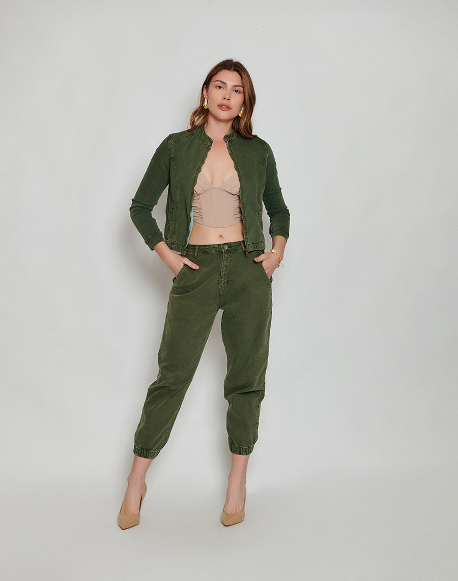 A pair of Jean Jacket and Joggers set for women giving a rugged biker babe look.