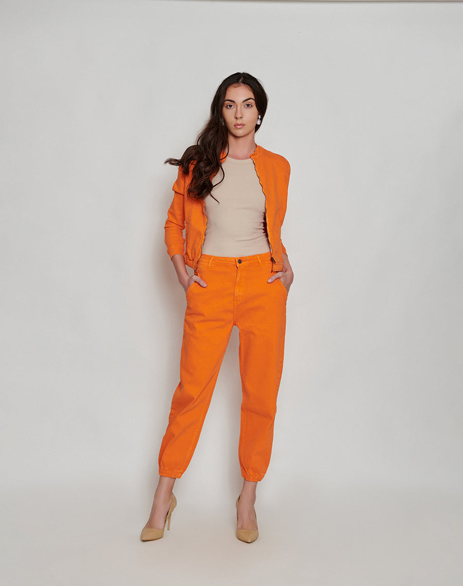 Design Details: Trucker jacket with front zip. Jogger-style denim pants with pocke...