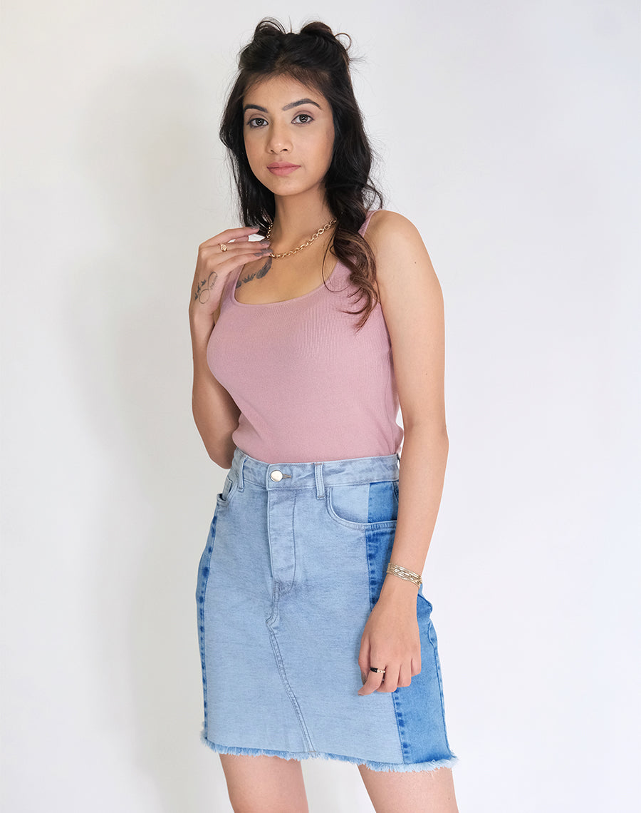 A double-shaded denim skirt that ups your denim game like no other denim outfit. Let’s go back to the 90s and own the femininity in denims.