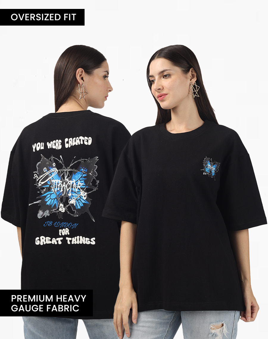 With loose fits in the talk recently, this black oversized T-shirt is for you to go to party or lounge wear. Styled with a butterfly print, make this black t-shirt your go-to choice.